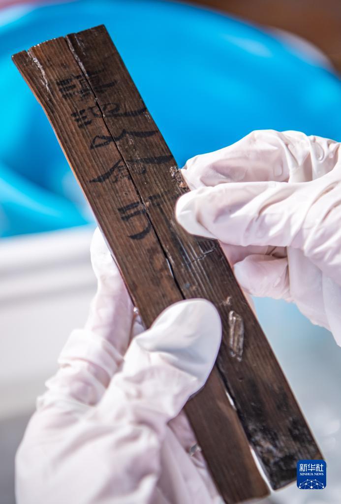 考古工作者在清理云南河泊所遺址出土的簡(jiǎn)牘(2022年9月21日攝)。