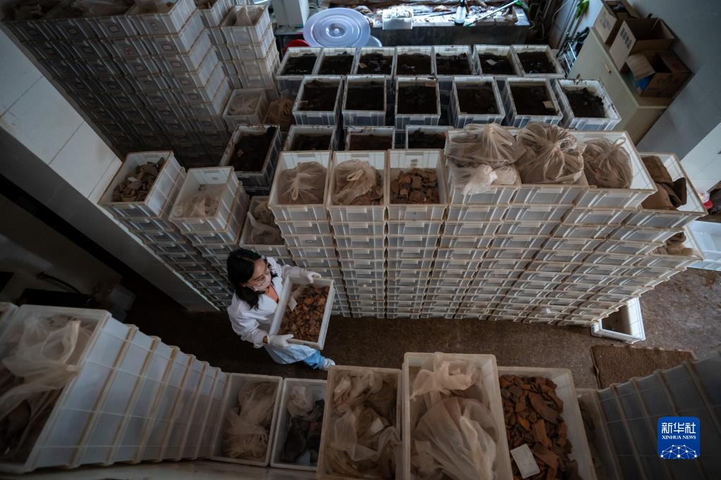 考古工作者在整理云南河泊所遺址出土的各類(lèi)文化遺物(2022年9月21日攝)。