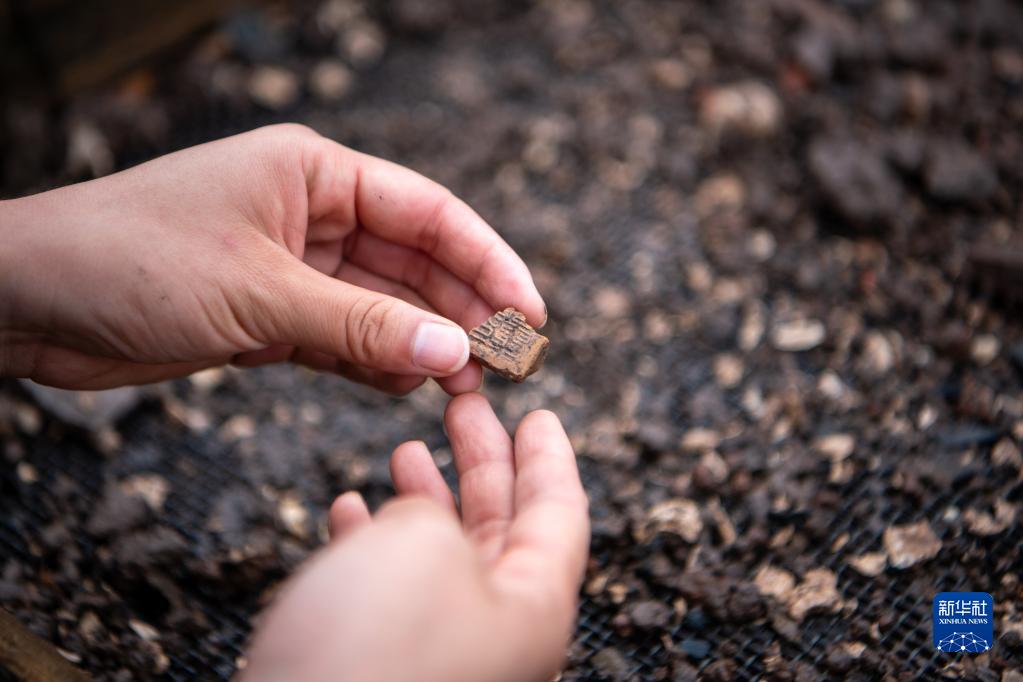 考古工作者在云南河泊所遺址現場(chǎng)檢查出土的封泥(2022年9月21日攝)。