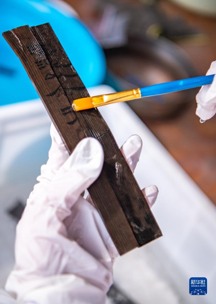 考古工作者在清理云南河泊所遺址出土的簡(jiǎn)牘(2022年9月21日攝)。