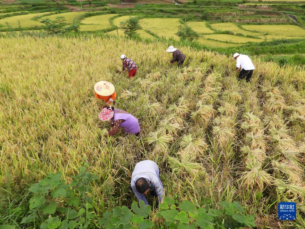 9月28日,村民在四川省達州市達川區米城鄉米城社區的梯田里收割有機稻。