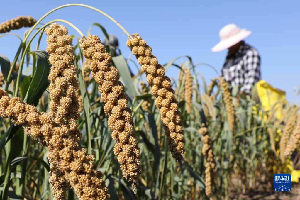 9月28日,河南省平頂山市寶豐縣商酒務(wù)鎮黃洼村農民在收獲谷子。