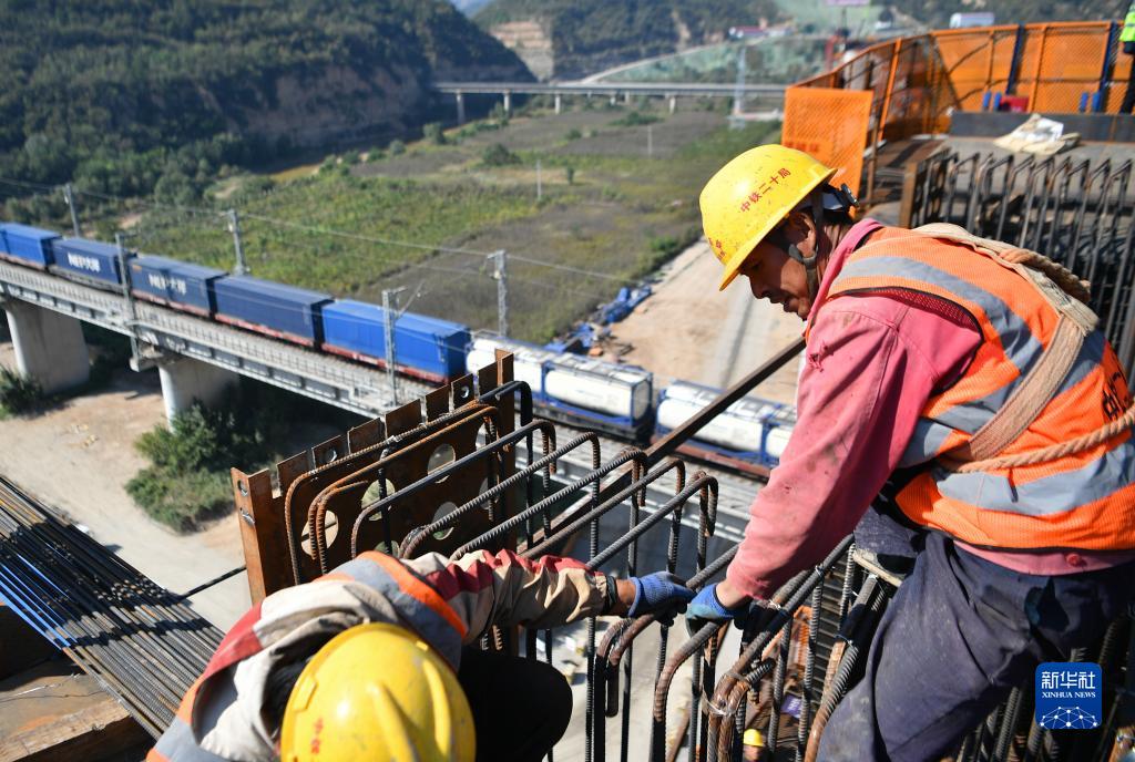 9月28日,中鐵二十局施工人員在位于延安市洛川縣的西延高鐵北洛河特大橋作業(yè)。