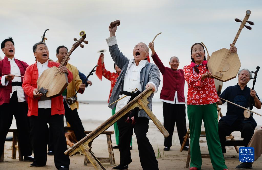 西北綜勘黃河老腔藝術(shù)團藝人在陜西省渭南市潼關(guān)縣黃河岸邊表演黃河老腔(9月26日攝)。