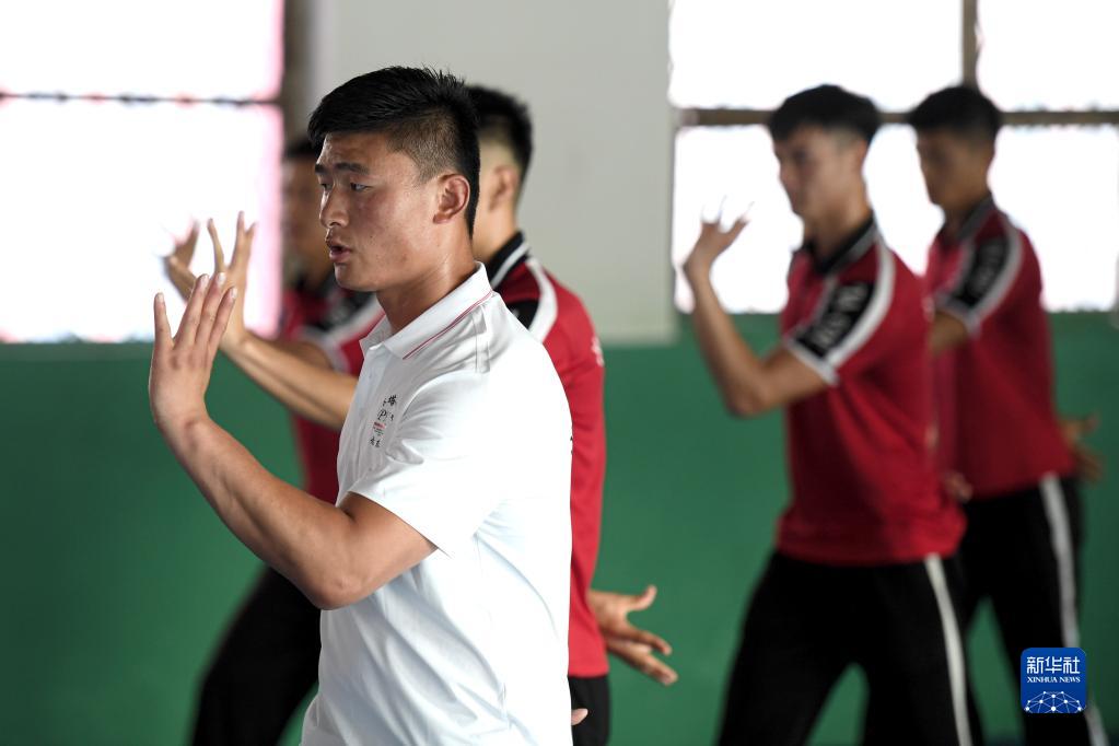 這是李迎港(前)在河南嵩山少林塔溝武校內給學(xué)生上課(2022年7月6日攝)。