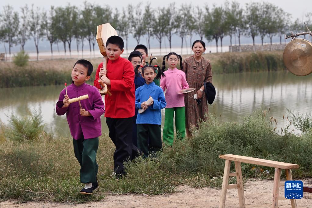 潼關(guān)縣秦東鎮濱河小學(xué)老師(右一)輔導學(xué)生練習“黃河老腔”(9月27日攝)。