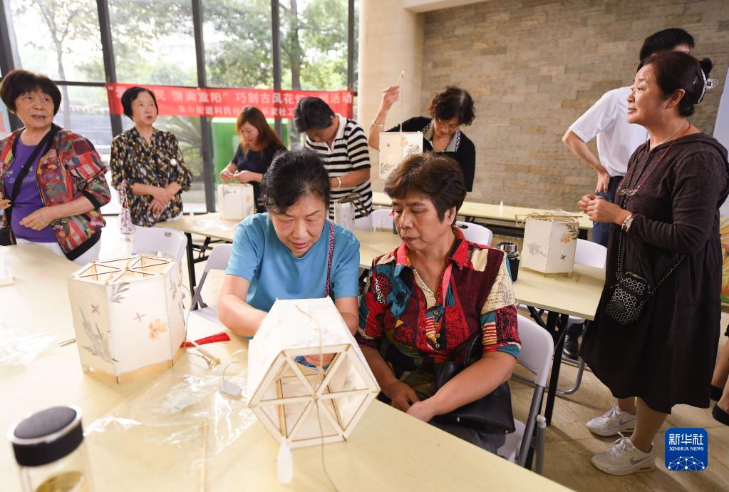 9月29日,在愛(ài)山街道利民社區,老年居民參加花燈制作。