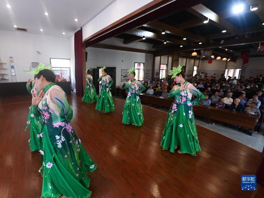 9月30日,老人們在杭州市臨安區河橋鎮河橋村文化禮堂觀(guān)看“柳溪暖陽(yáng)”黨員助老志愿服務(wù)隊編排的節目。