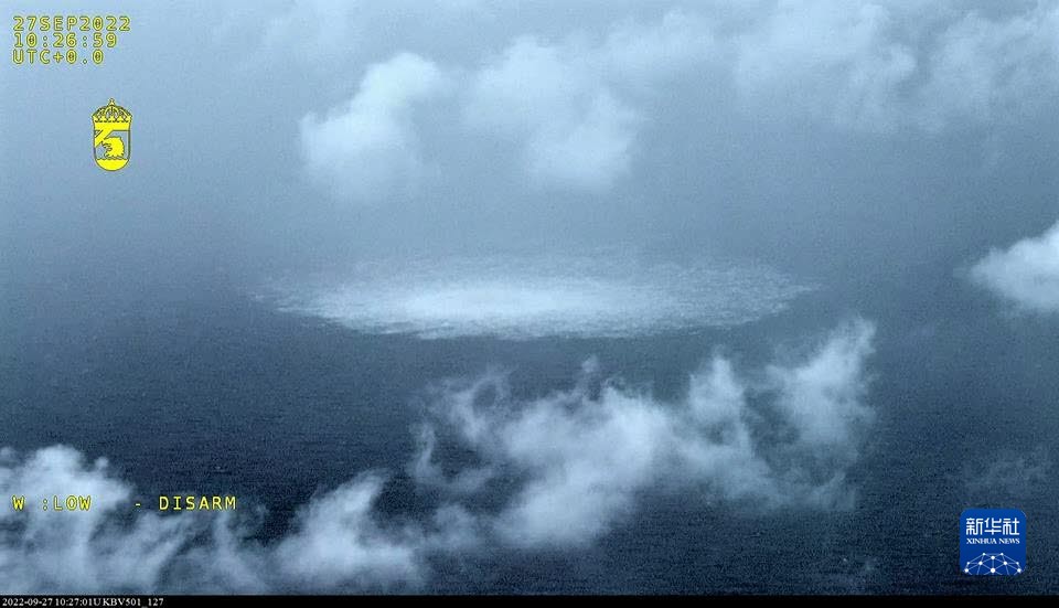 這張瑞典海岸警衛隊9月27日發(fā)布的航拍照片顯示的是一處“北溪”天然氣管道泄漏點(diǎn)。