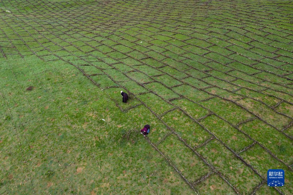 在四川省若爾蓋縣麥溪鄉黑河村,當地藏族群眾在用高原柳編織沙障(2022年7月25日攝,無(wú)人機照片)。