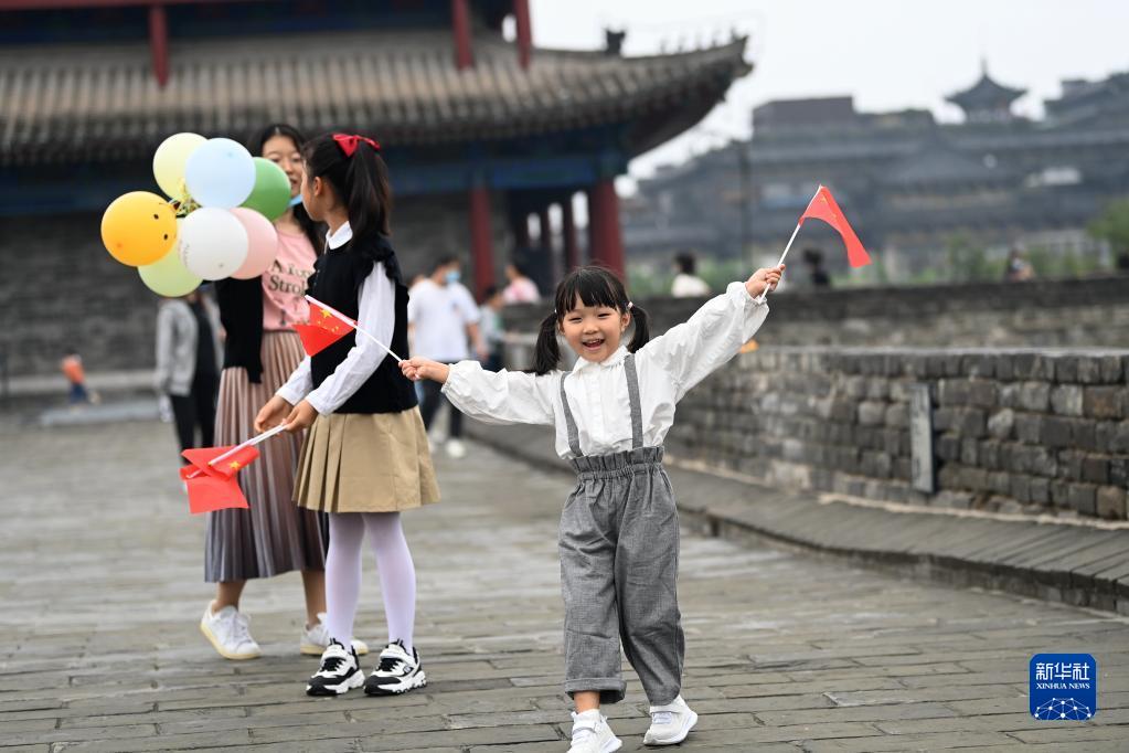 10月1日,在陜西省西安市,小游客手持國旗在西安城墻景區參觀(guān)游覽。