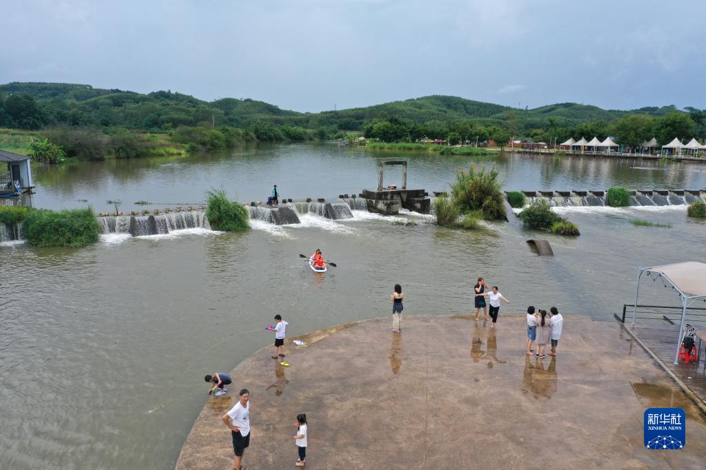 10月1日,游客在廣西南寧市良慶區那馬鎮竹泉島景區游玩(無(wú)人機照片)。
