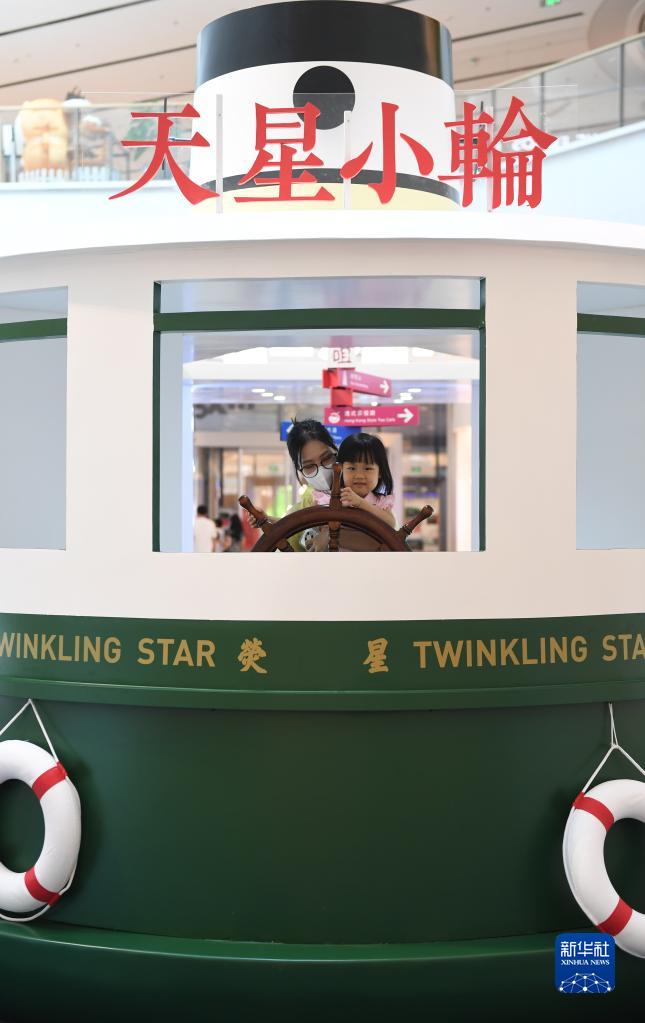 10月1日,在“再遇@香港”展覽上,市民在天星小輪場(chǎng)景里拍照打卡。
