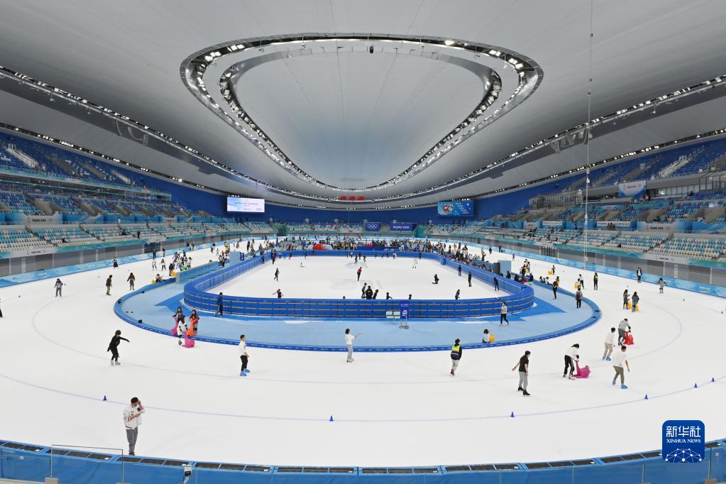 10月1日,人們在“冰絲帶”內體驗冰雪運動(dòng)。