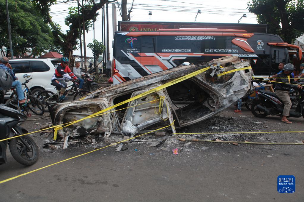 這是10月2日在印度尼西亞?wèn)|爪哇省瑪瑯市事發(fā)球場(chǎng)外拍攝的被焚毀的車(chē)輛。新華社發(fā)(巴尤·諾凡塔攝)
