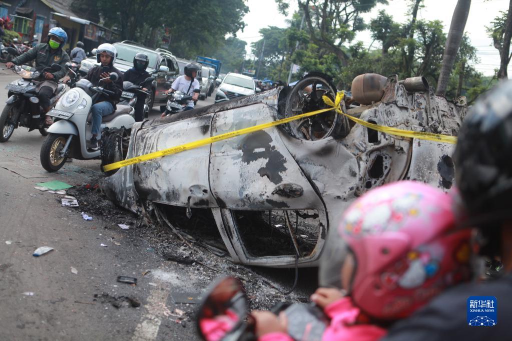 10月2日,在印度尼西亞?wèn)|爪哇省瑪瑯市,人們騎車(chē)經(jīng)過(guò)事發(fā)球場(chǎng)外被焚毀的車(chē)輛。新華社發(fā)(巴尤·諾凡塔攝)