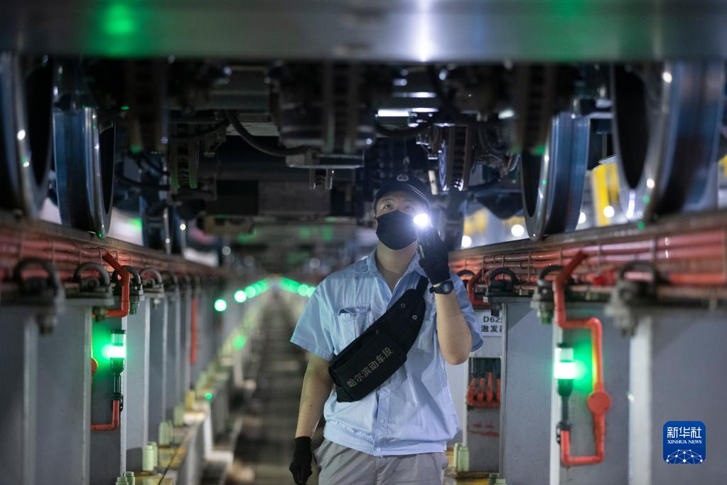 10月1日晚,在中國鐵路哈爾濱局集團有限公司哈爾濱動(dòng)車(chē)段檢修車(chē)間內,動(dòng)車(chē)組地勤機械師龔雨茁在進(jìn)行檢修作業(yè)。