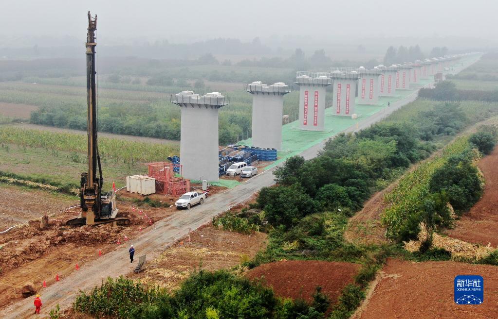 10月2日,中鐵上海工程局施工人員在位于陜西省西安市的西十高鐵浐河特大橋操作旋轉挖機(無(wú)人機照片)。