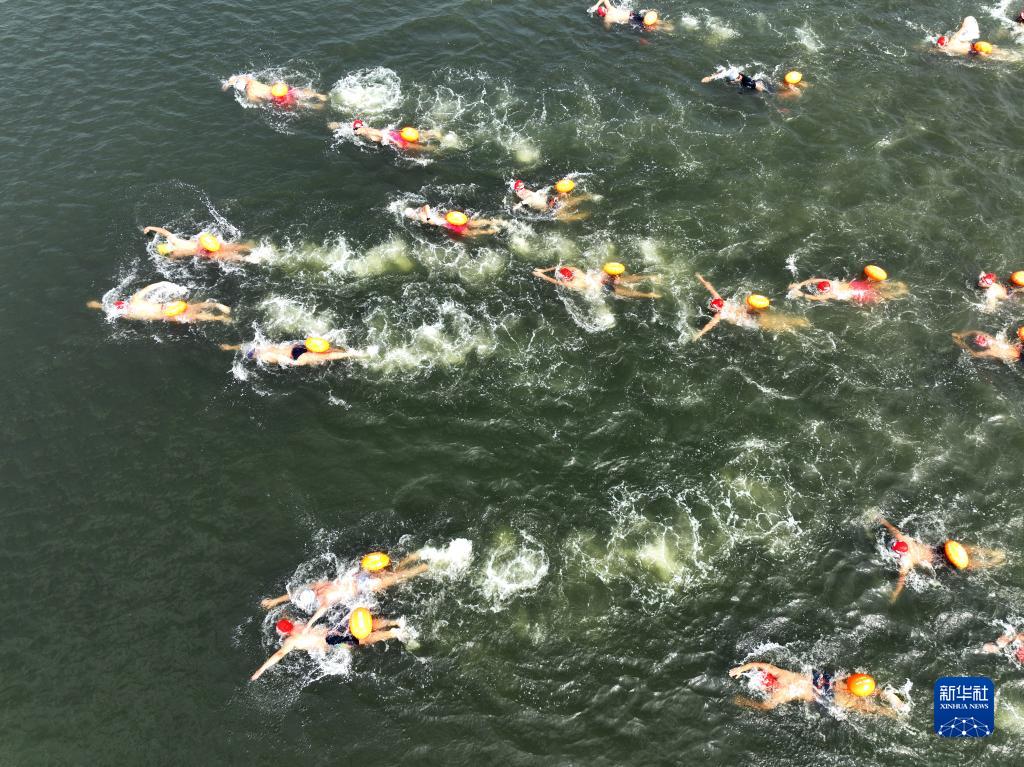 10月2日,游泳愛(ài)好者在江蘇省連云港市贛榆區心海湖上進(jìn)行游泳比拼(無(wú)人機照片)。