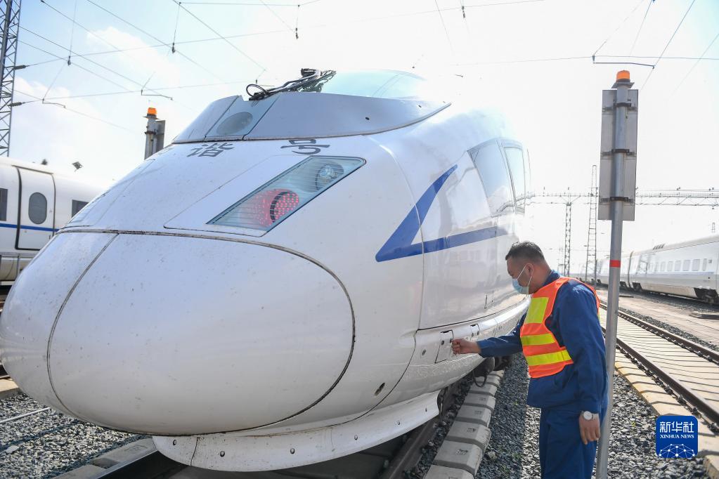 10月2日,在長(cháng)春動(dòng)車(chē)運用所,技術(shù)人員朱磊檢查列車(chē)設備。