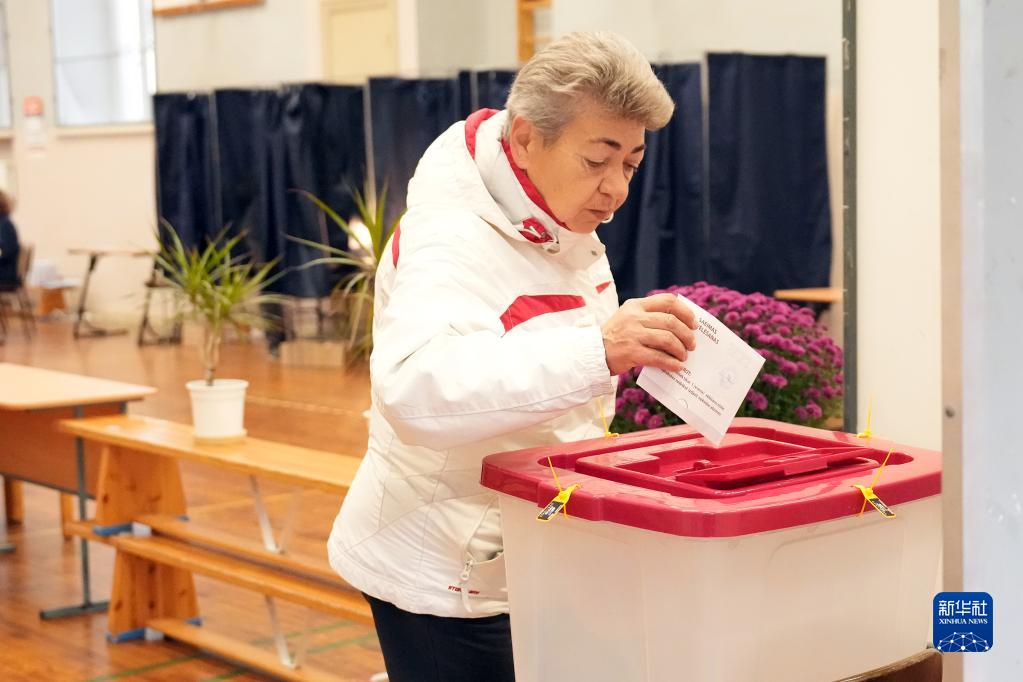 10月1日,一名拉脫維亞婦女在首都里加的投票站投票。