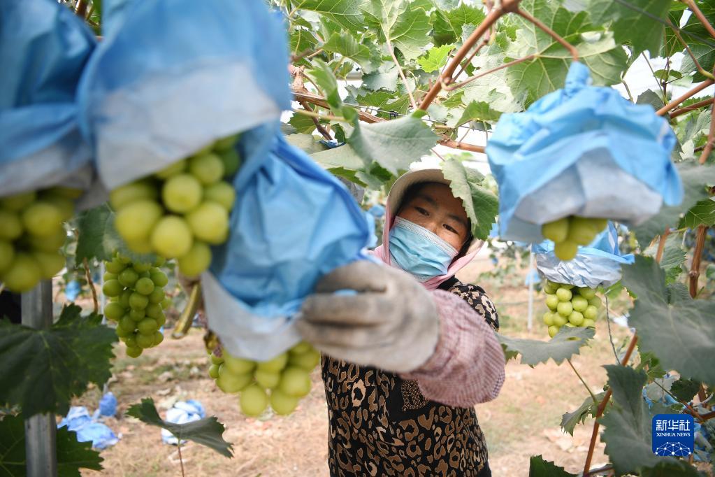 寧夏銀川市永寧縣望洪鎮高渠村村民在大棚采摘“陽(yáng)光玫瑰”葡萄(10月2日攝)。