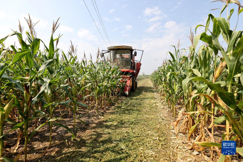 10月3日,山東省棗莊市市中區西王莊鎮農民駕駛農機收獲玉米。