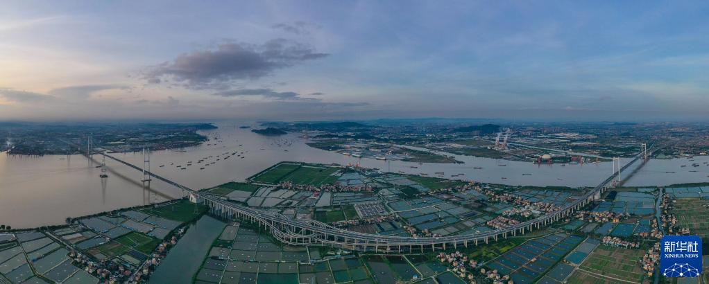 南沙大橋全景(2022年6月29日攝,無(wú)人機照片)。南沙大橋上跨珠江口獅子洋水域,連接廣州市南沙區東涌鎮、番禺區海鷗島和東莞市沙田鎮。