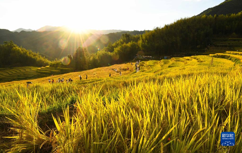 這是10月3日拍攝的落日下的廣東省清遠市連山壯族瑤族自治縣太保鎮歐家村歐家梯田美景。該梯田進(jìn)入最佳觀(guān)賞期。