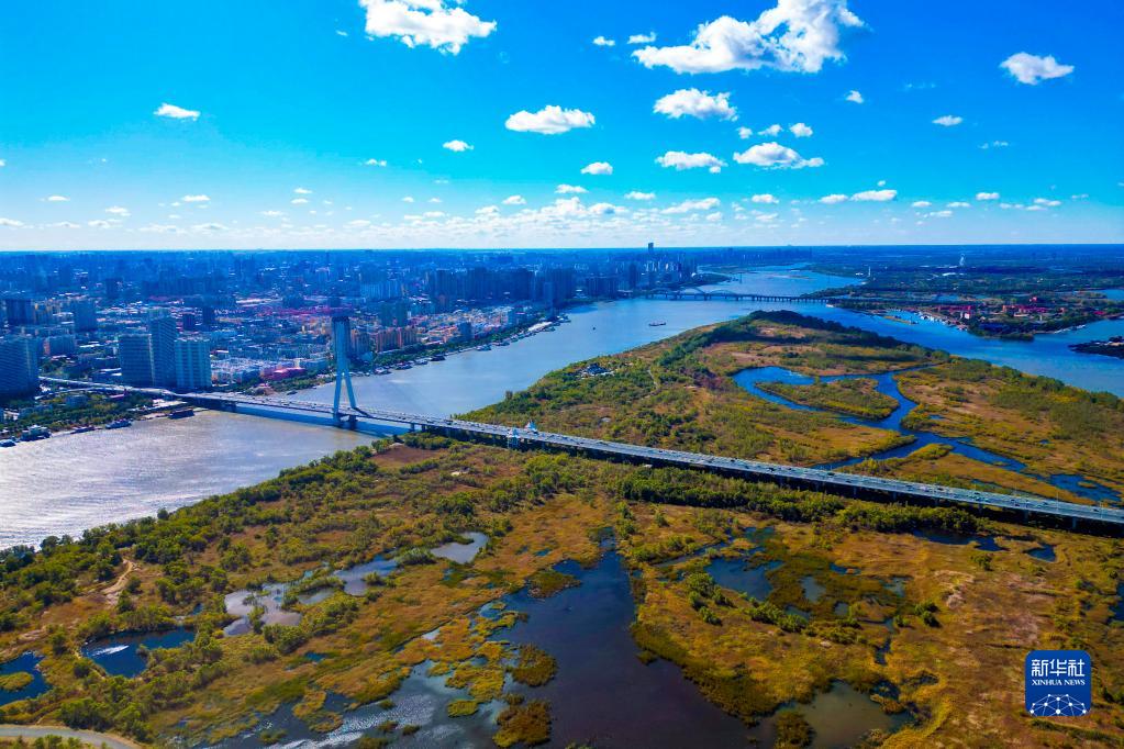 這是10月4日拍攝的哈爾濱市阿勒錦島國家級濕地公園景色(無(wú)人機照片)。