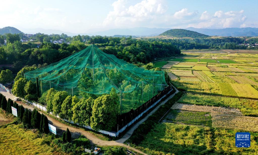 位于漢中市洋縣的陜西朱鹮人工繁育中心放飛大籠(2021年5月12日攝,無(wú)人機照片)。新華社記者 陶明 攝