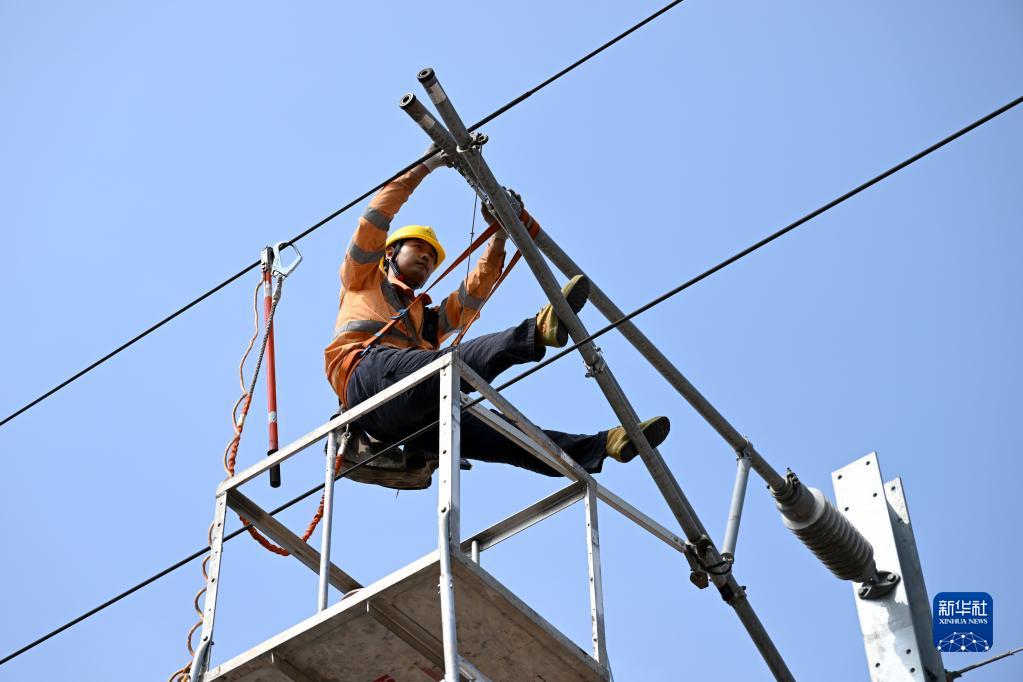 10月4日,在位于安徽黃山的杭昌高速鐵路黃山北存車(chē)場(chǎng),接觸網(wǎng)工在檢修接觸網(wǎng)設備。