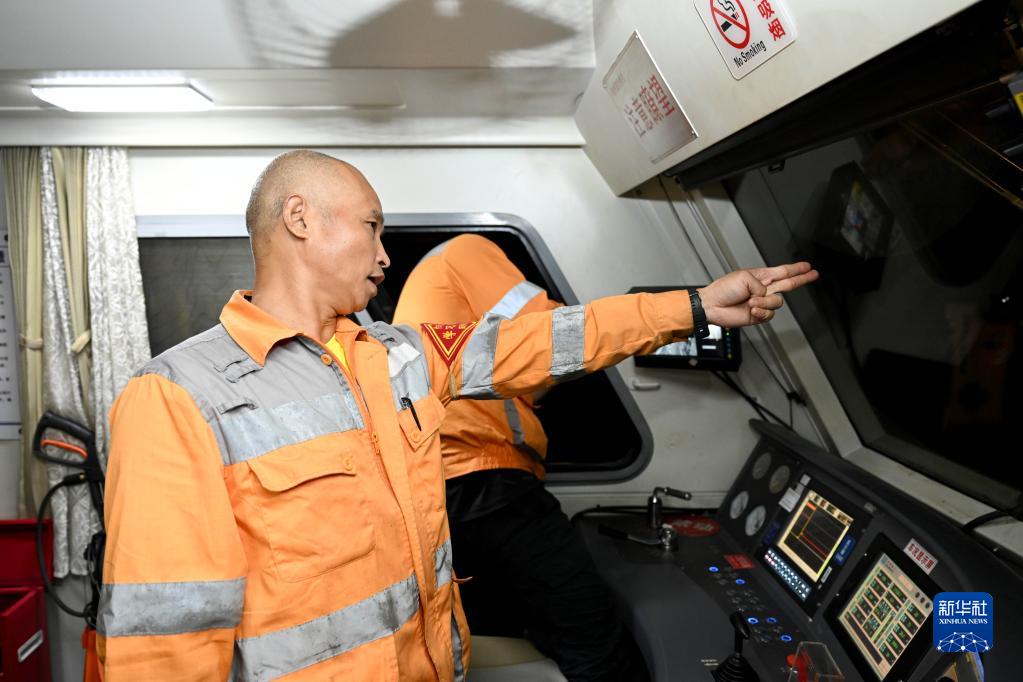 10月4日晚,在安徽宣城,中國鐵路上海局集團有限公司南京供電段績(jì)溪北接觸網(wǎng)工區接觸網(wǎng)檢修作業(yè)車(chē)司機在確認出站信號。