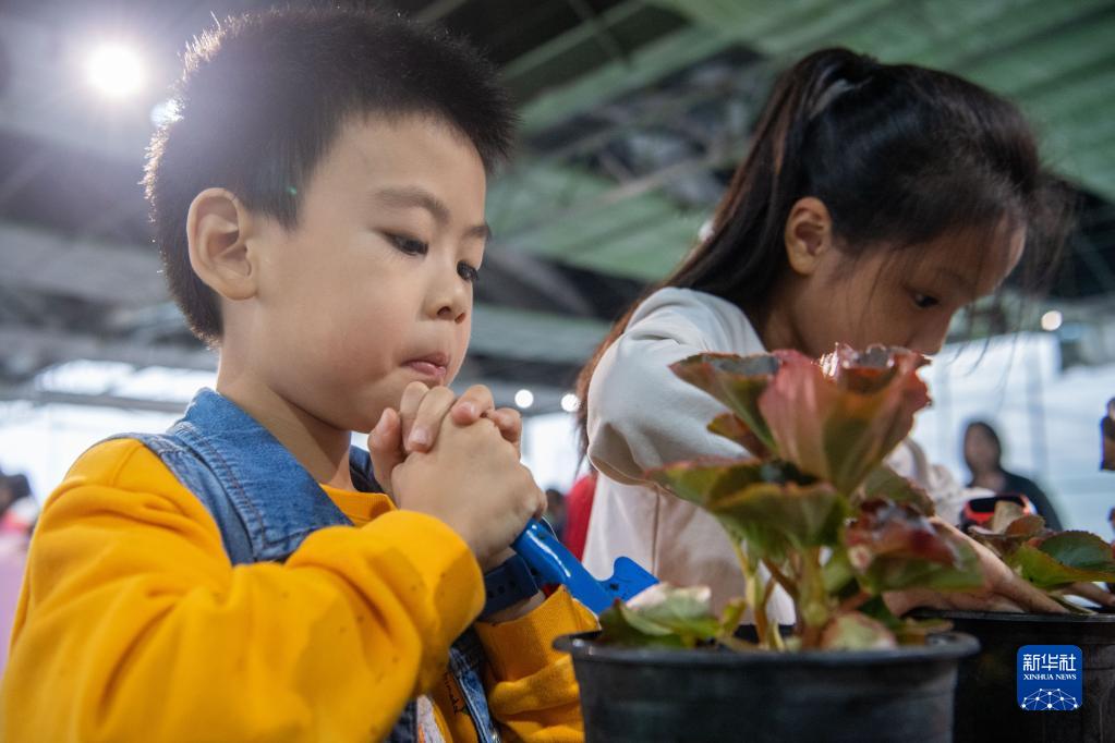 10月5日,在天華百卉園內,小朋友在學(xué)習種植技巧。