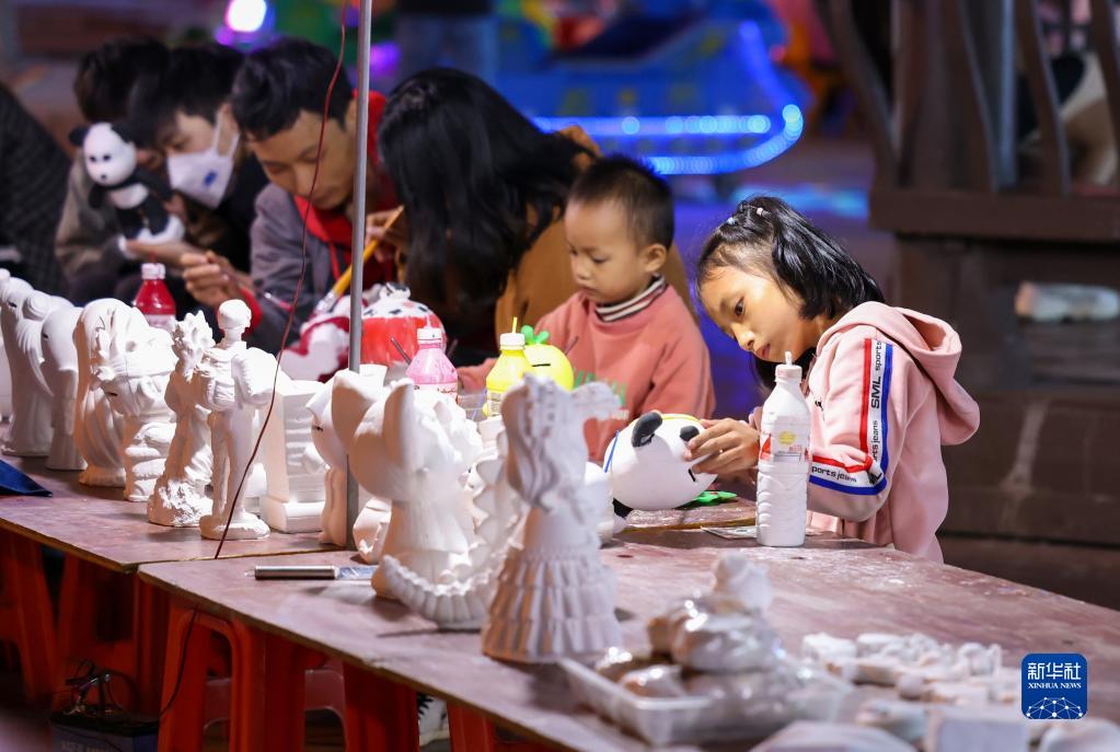 10月5日晚,市民在貴州省銅仁市玉屏侗族自治縣街心花園給石膏像上色。
