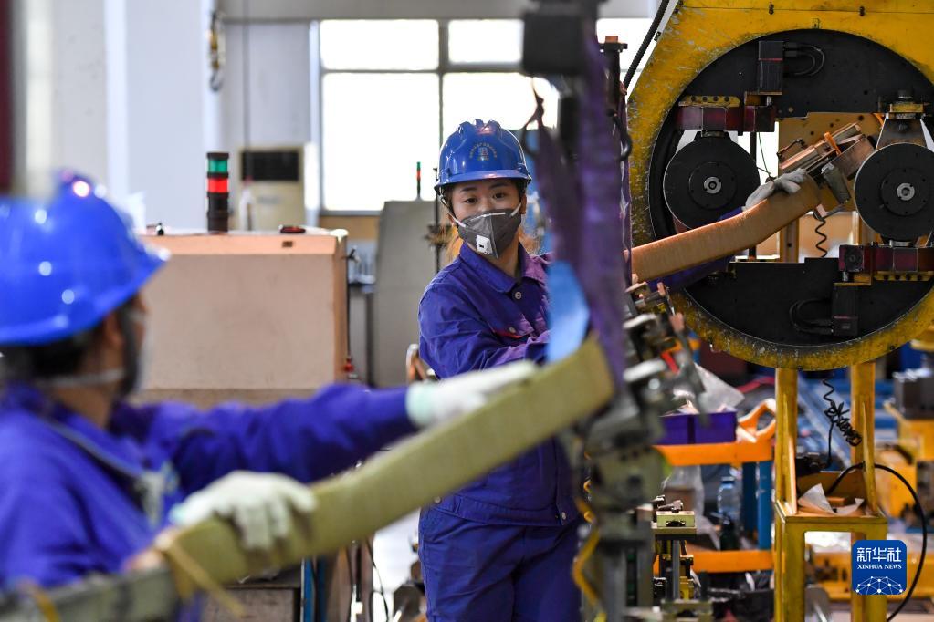 10月6日,在哈電集團哈爾濱電機廠(chǎng)有限責任公司的生產(chǎn)車(chē)間,楊萌(右)與同事配合作業(yè)。