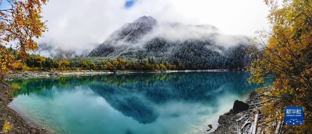 這是10月7日在世界自然遺產(chǎn)地九寨溝拍攝的雪后景色(拼接照片)。