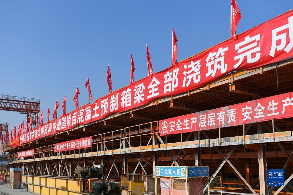 10月8日,深中通道中山智慧梁場(chǎng)的第155片60米混凝土箱梁完成預制。新華社記者 劉大偉 攝