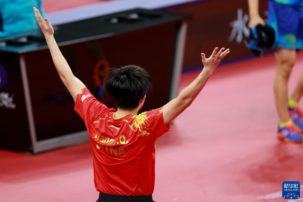 10月8日,中國隊選手王楚欽在獲勝后慶祝,他以3比0戰勝日本隊選手戶(hù)上隼輔。