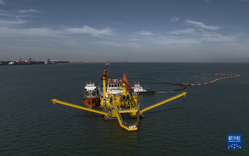 10月8日,施工船在唐山港京唐港區第四港池25萬(wàn)噸級航道工程建設工地施工(無(wú)人機照片)。新華社記者 楊世堯 攝