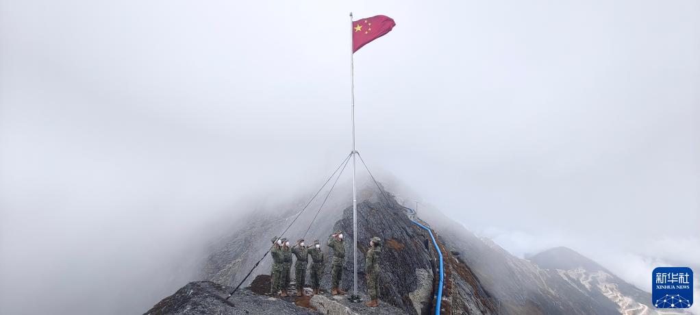 10月1日,西藏亞?wèn)|海拔4655米的詹娘舍哨所官兵在哨所旁的崖壁上舉行升旗儀式。