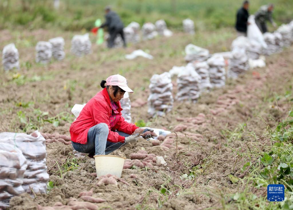 10月8日,在湖南省資興市唐洞街道程水村紫薯種植基地,村民在分揀紫薯。新華社發(fā)(李科 攝)