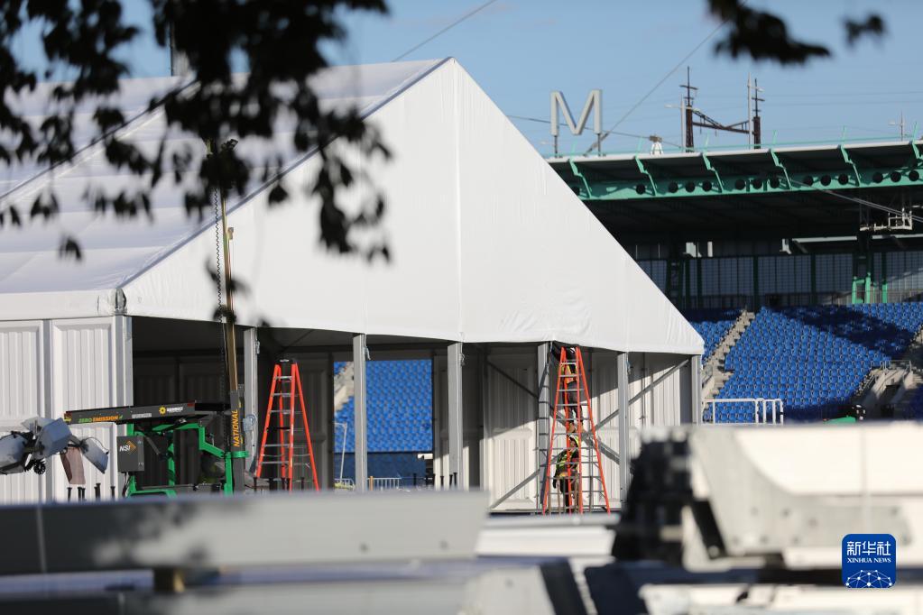10月9日,工人在位于美國紐約市蘭德?tīng)枍u的移民救援中心建設工地工作。
