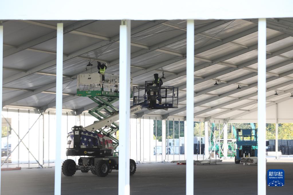 10月9日,工人在位于美國紐約市蘭德?tīng)枍u的移民救援中心建設工地工作。