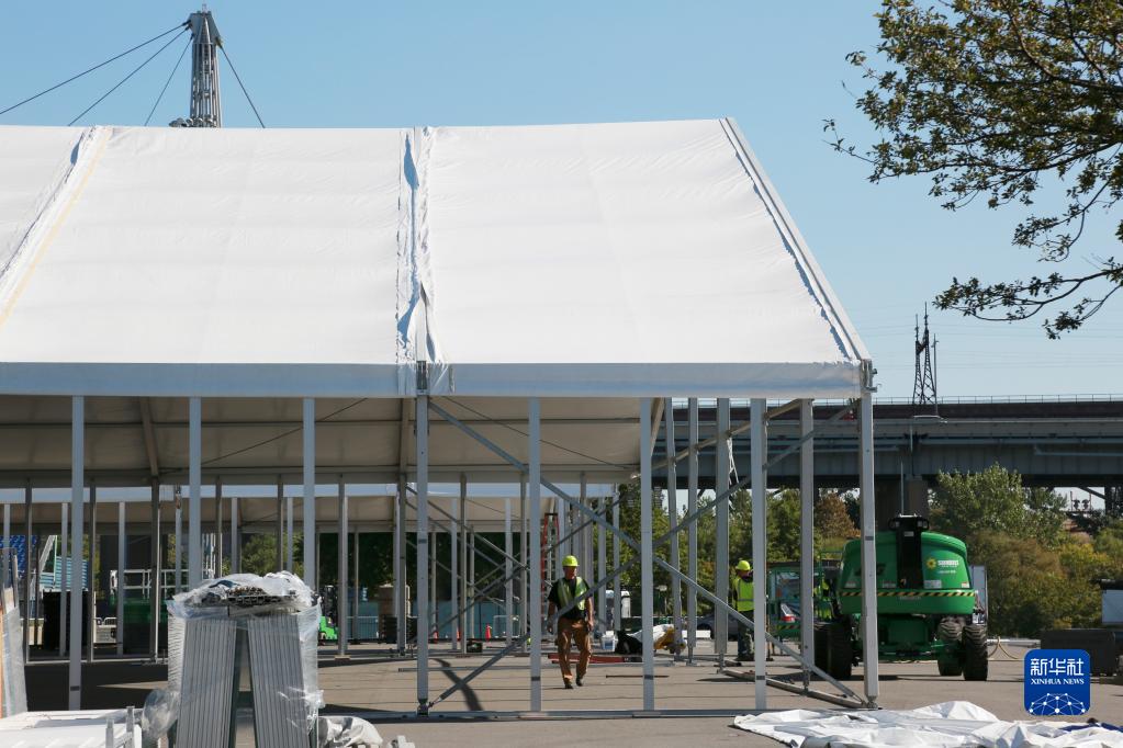 10月9日,工人在位于美國紐約市蘭德?tīng)枍u的移民救援中心建設工地工作。