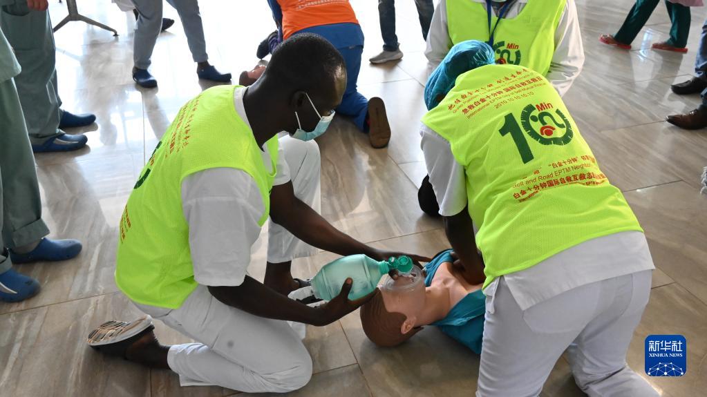 第29批中國援幾內亞醫療隊10日在幾內亞首都科納克里的中幾友好醫院開(kāi)展急救培訓活動(dòng)。此次活動(dòng)主題為“急救白金十分鐘,國際自救互救日”,援幾醫療隊為中幾友好醫院的醫護人員開(kāi)展了心肺復蘇、海姆立克急救、轉運患者、急診接診等項目的演練和培訓。