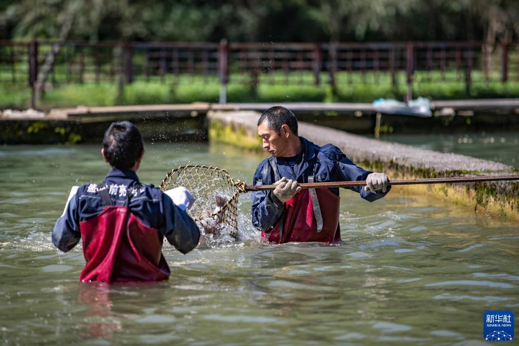 10月11日,在重慶市城口縣蓼子鄉明安村冷水魚(yú)產(chǎn)業(yè)基地,工作人員在捕撈準備出售的虹鱒魚(yú)。