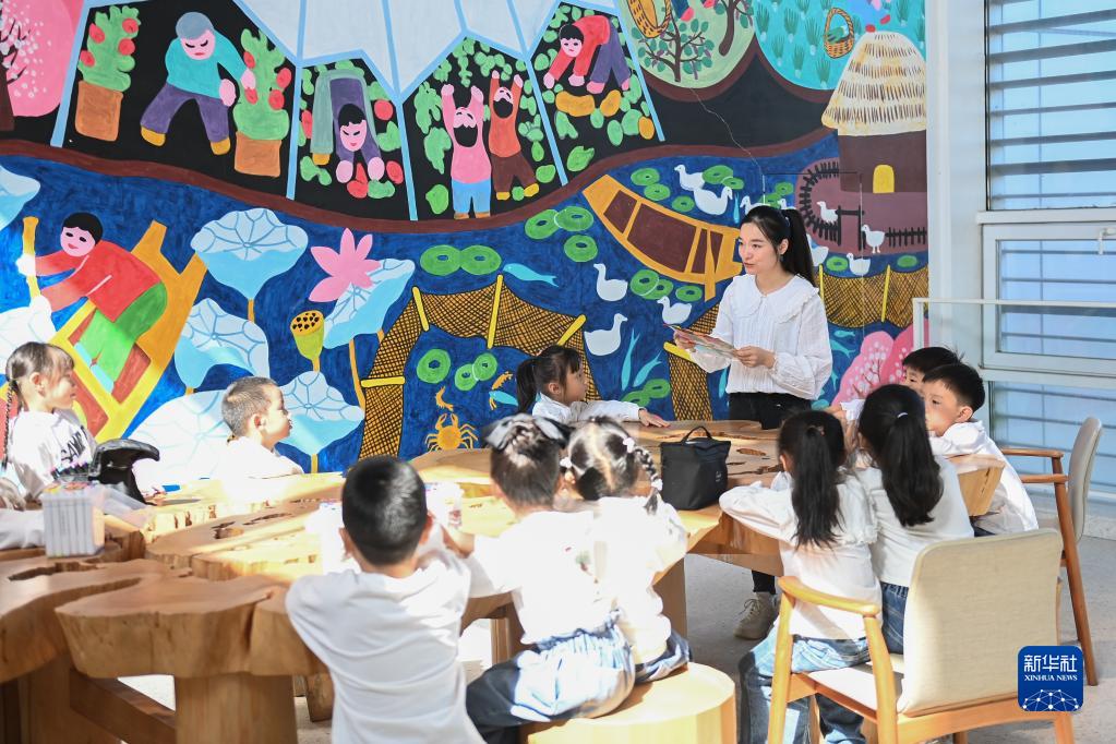 10月14日,湖州市吳興高新區中心幼兒園的老師在靈糧農場(chǎng)向小朋友介紹糧食知識,倡導節約糧食的習慣養成。
