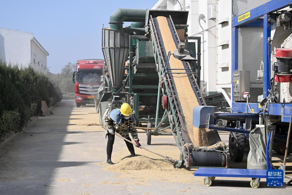 10月13日,在中央儲備糧合肥直屬庫有限公司本部,稻谷被傳送帶轉運至倉房?jì)取?/p>