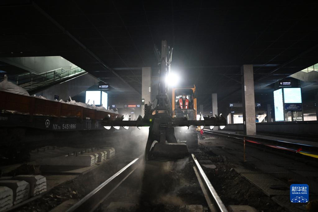 10月14日,施工者在天津西站操作機械設備進(jìn)行換枕作業(yè)。